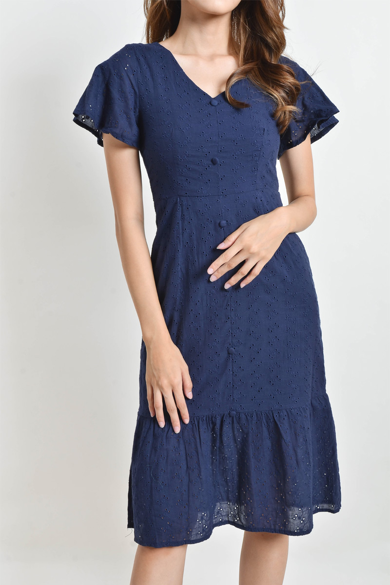 Annabelle Eyelet Flare Sleeve Midi Dress - Navy