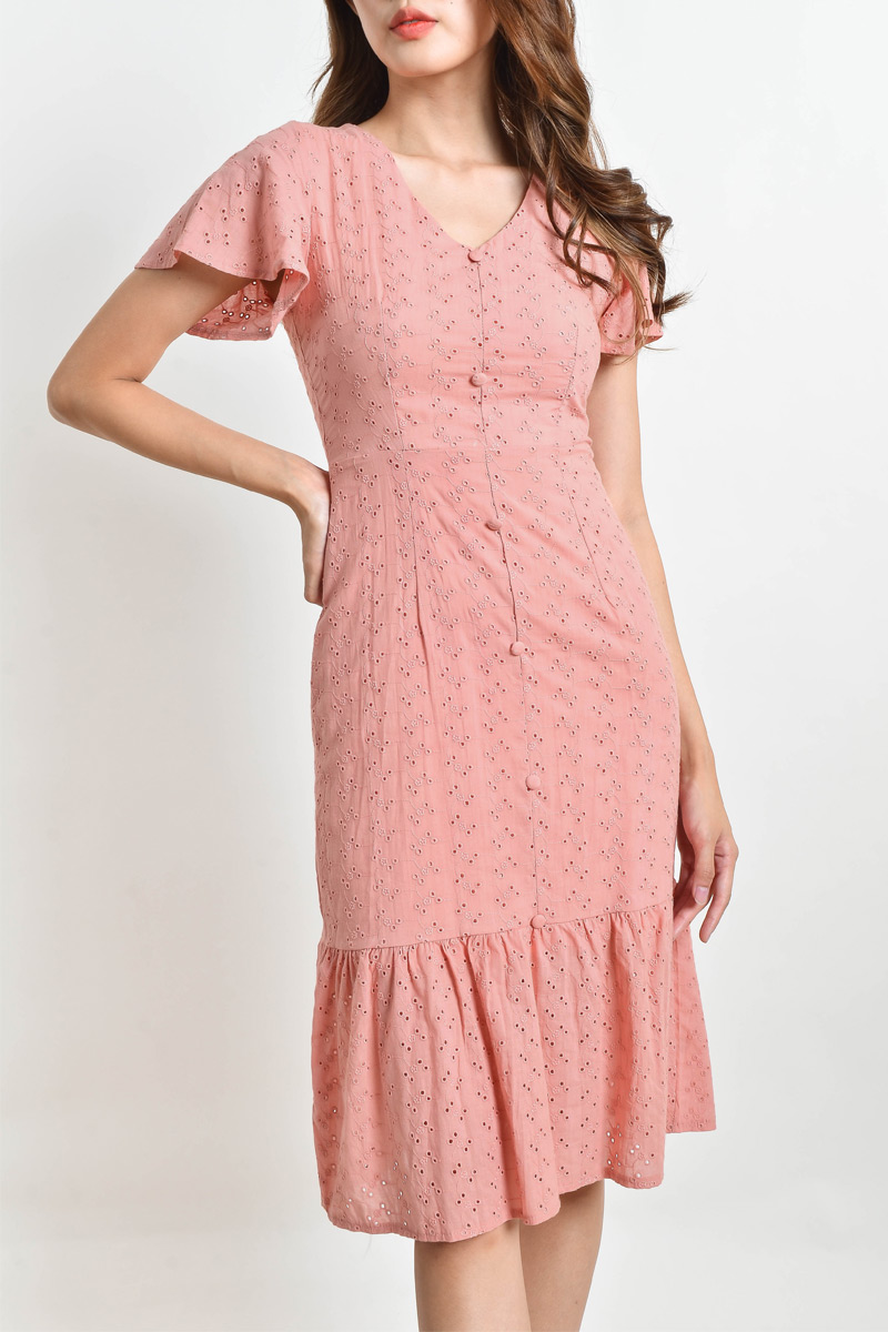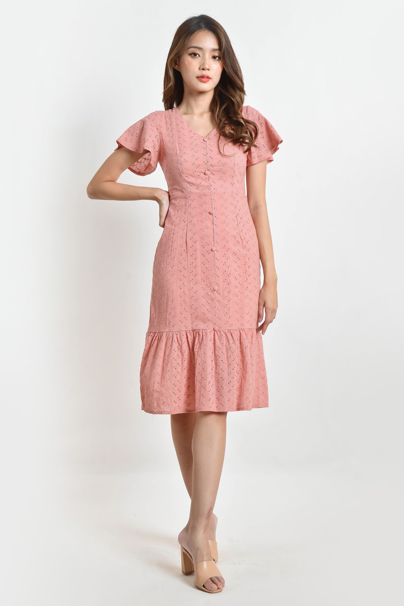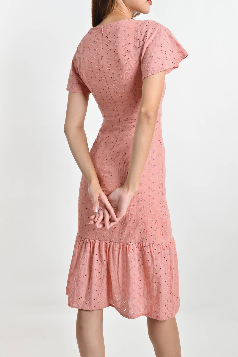 Annabelle Eyelet Flare Sleeve Midi Dress - Pink