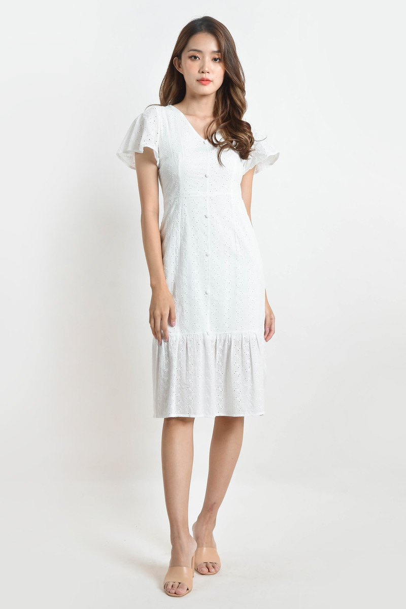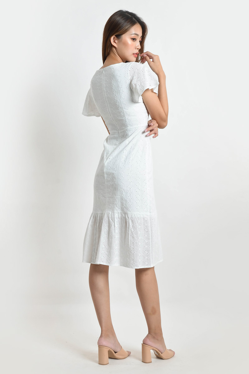 Annabelle Eyelet Flare Sleeve Midi Dress - White