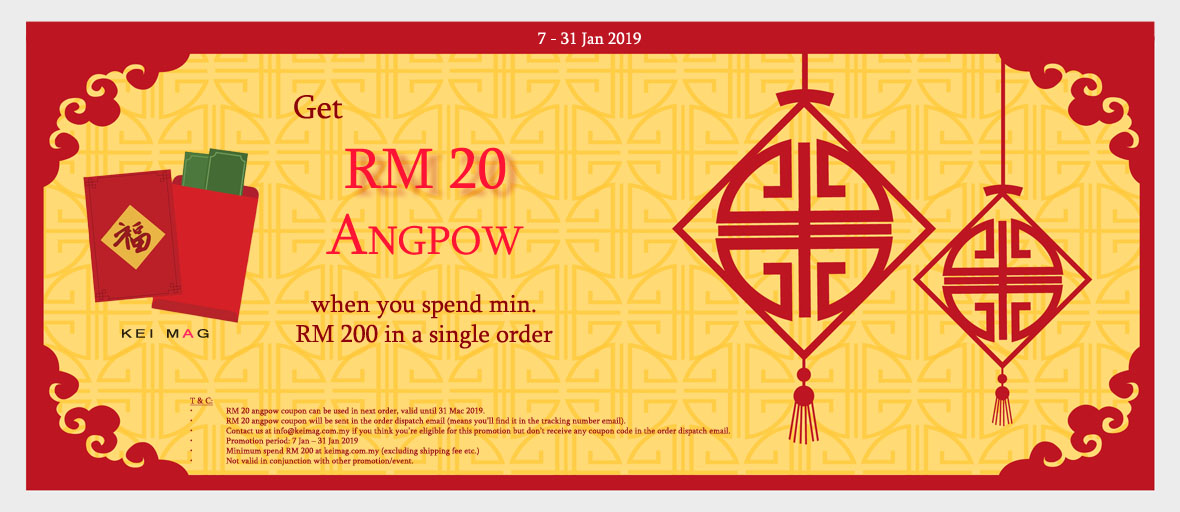 Get RM 20 Angpow when you spend minimum RM 200 in a single order. From 7-31 Jan 2019.